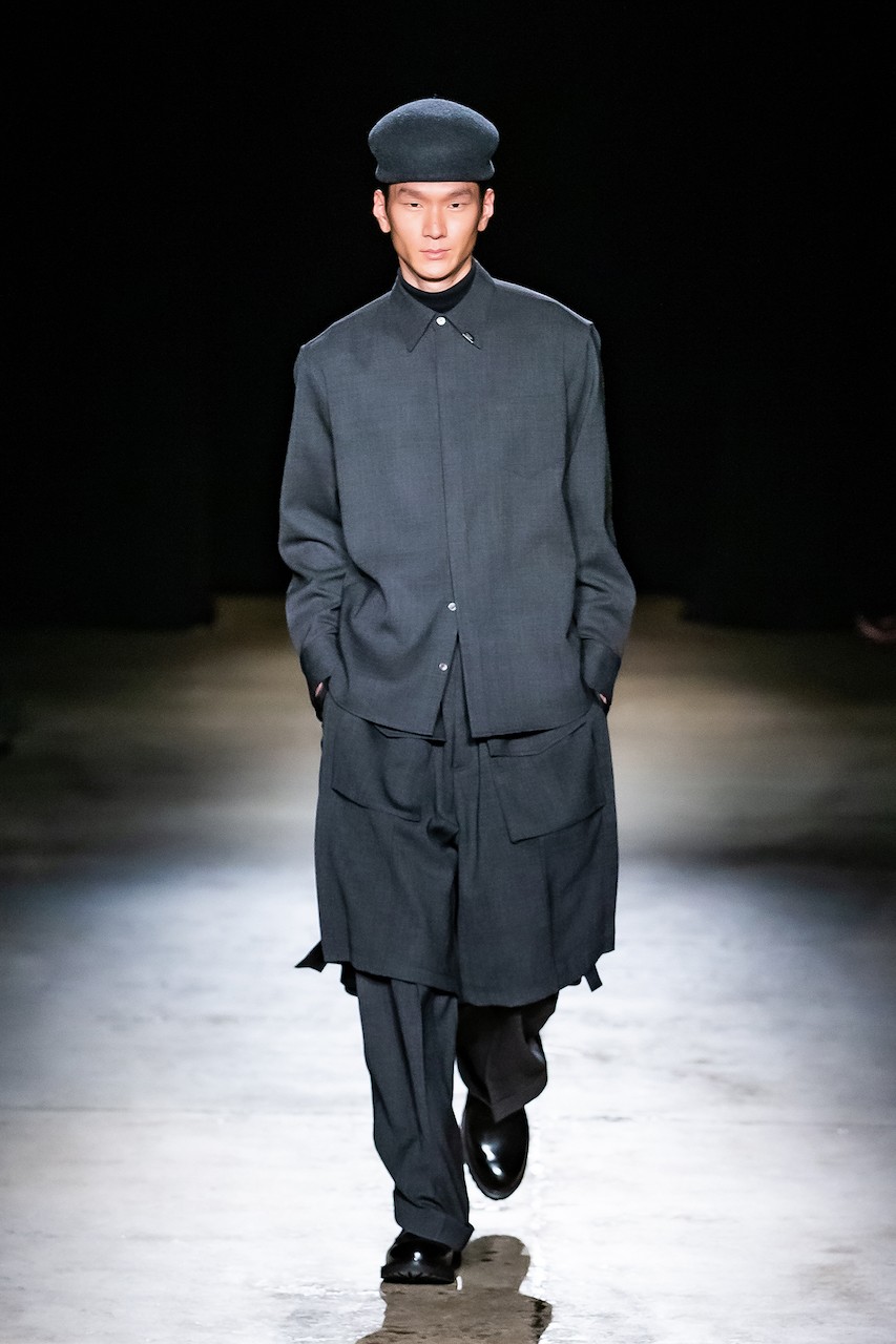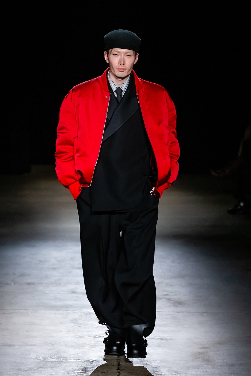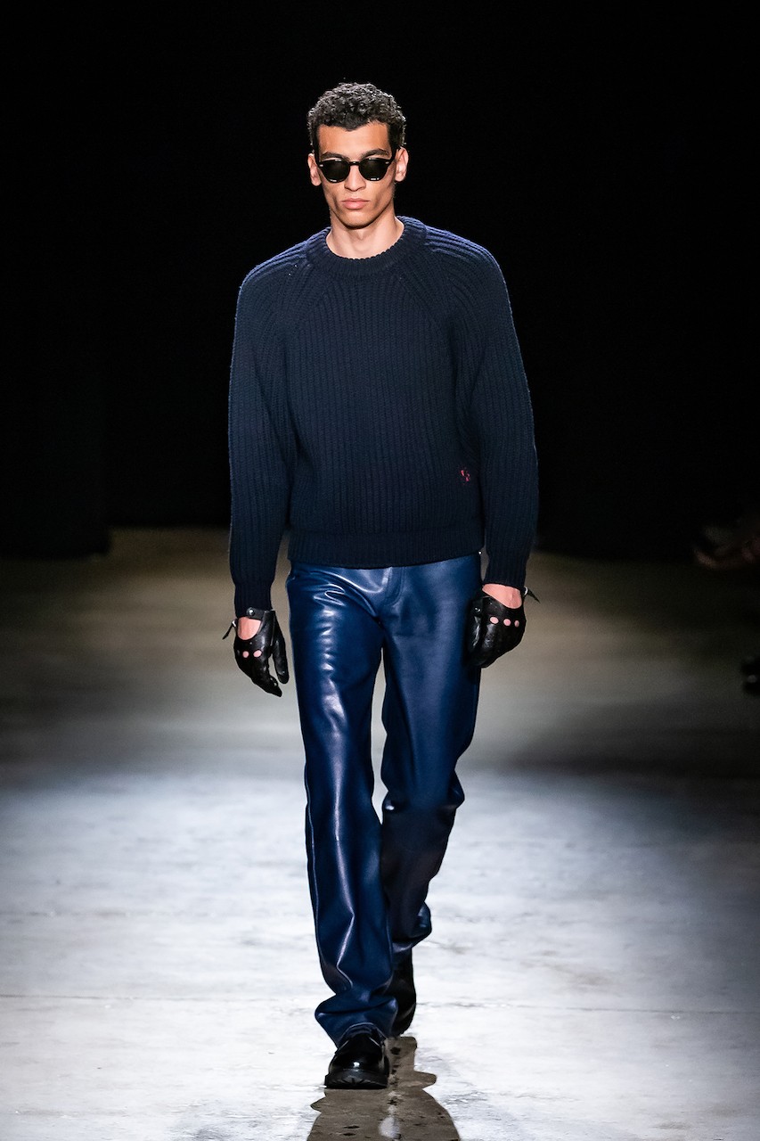 Other highlights included hybrid garments that mirrored the brand’s blend of manifold points of view—shorts that referenced trousers, outerwear that felt both bomber and sweatshirt, and soft knits contrasted against glossy leathers. The palette stayed grounded in neutral blacks, grays, and blues, while bursts of red and a hazy city print brought a jolt of energy.