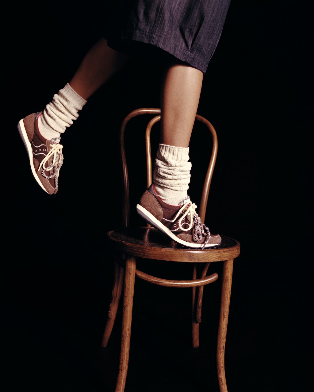 The collaboration revisits Saucony’s archival Trainer 80 model. While the original leaned into performance-forward design, the new iteration slows things down. The form draws from workwear references, only to be softened into an everyday, approachable silhouette. Packaged in a sun-faded, woody tone, the pair pieces together hairy suede with bold stitching, finished with fuzzy shoestrings.