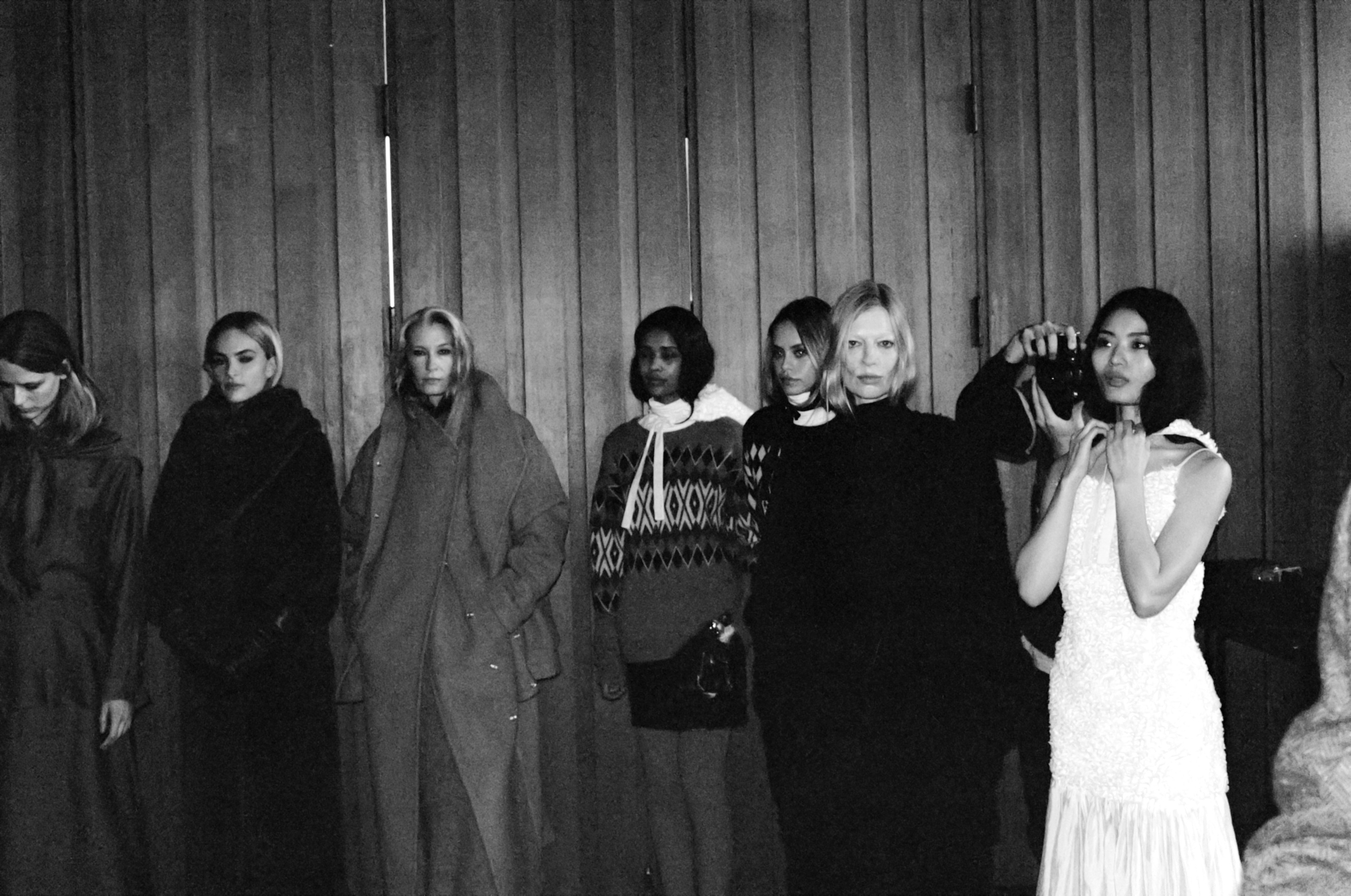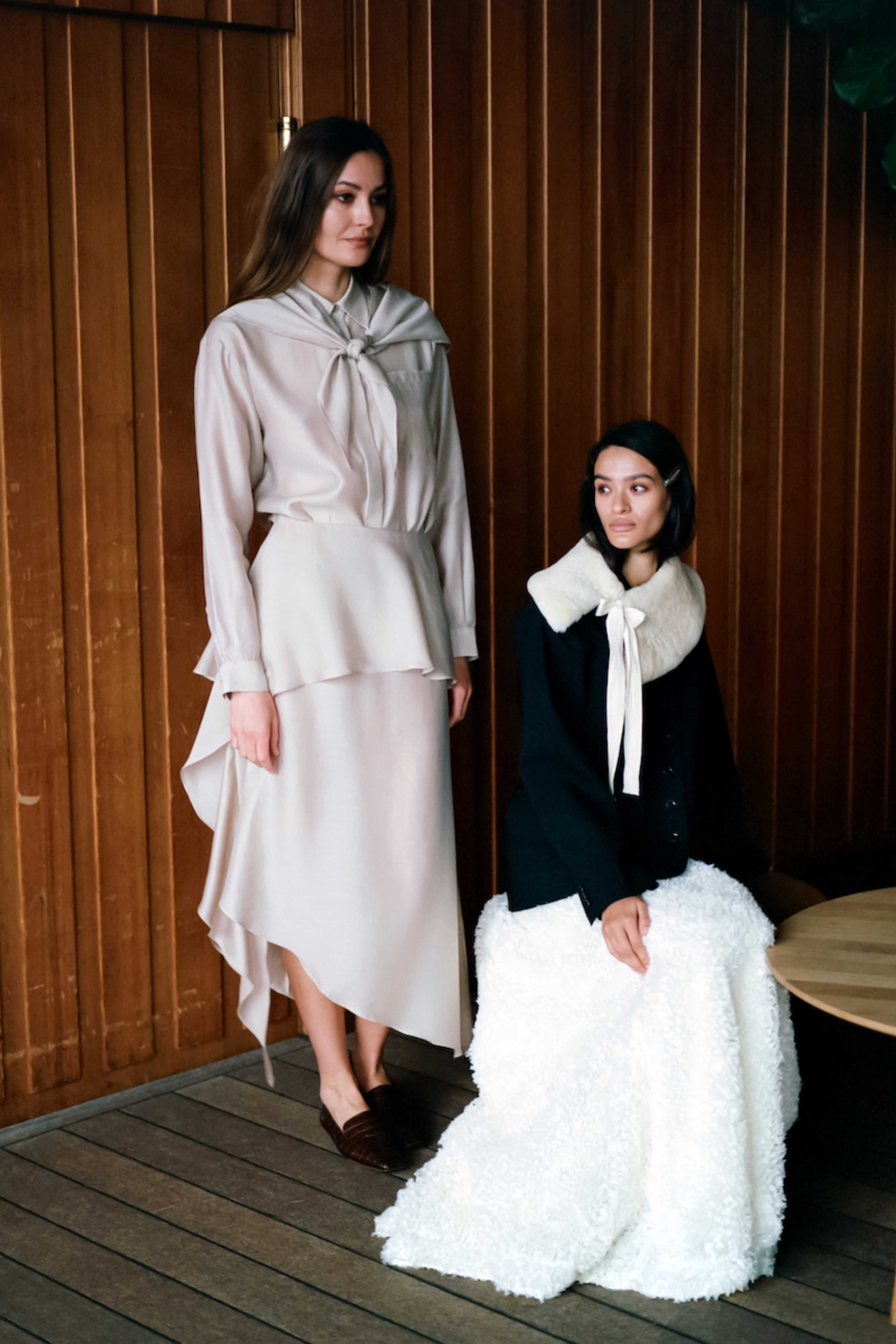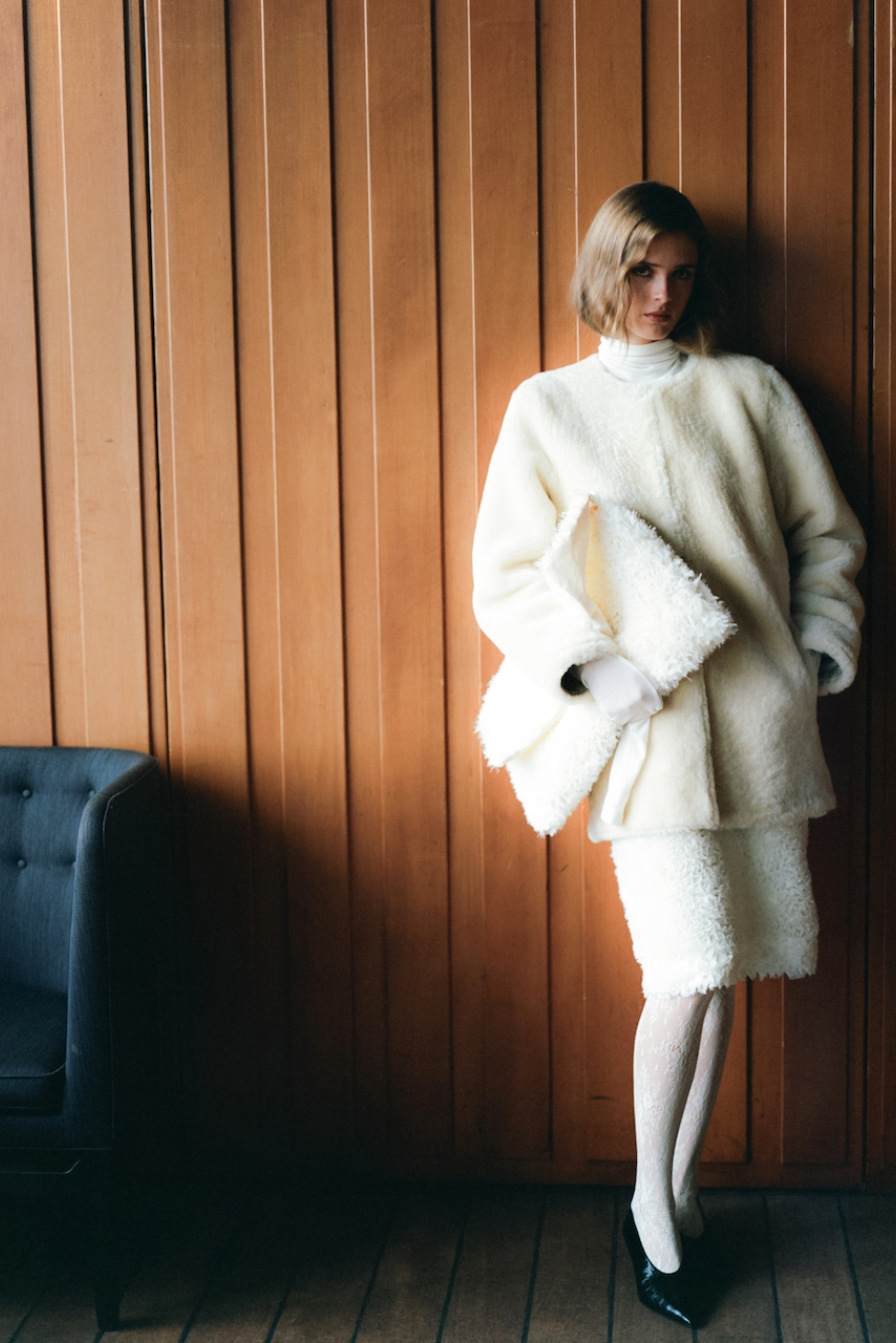 Material contrasts mirror that need for perpetual mutability. Fluid silk dresses and multi-layered sheers soften the silhouette, while merino, double-faced wool, and Portuguese herringbone add an effortless element of warmth and tailoring. The palette is grounded in a deliberate starkness—navy and black as foundation, lifted by ivory and toast, deepened with merlot and espresso. “The collection is really classic,” Eskildsen notes.
