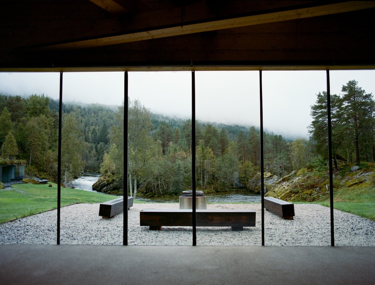 Our next stop, Juvet Landscape Hotel, blurred the line between architecture and wilderness. Its detached glass-walled cabins, clad in matte black, dissolve into the surrounding forest, a striking contrast to the wild river running below. Juvet’s cinematic credentials precede it: it was the filming location for Ex Machina and later appeared in Succession, serving as Lukas Matsson’s luxurious hideaway. Dinner here is communal, served at a long wooden table in a restored barn, a three-course menu built entirely around local, seasonal ingredients. That night, conversation flowed between couples from Denmark, the U.S., Asia, and London, each of us drawn together by good food, curiosity, and the soft crackle of the fire. The bathhouse by the river later offered quiet reflection, the perfect punctuation to an evening of connection and stillness.